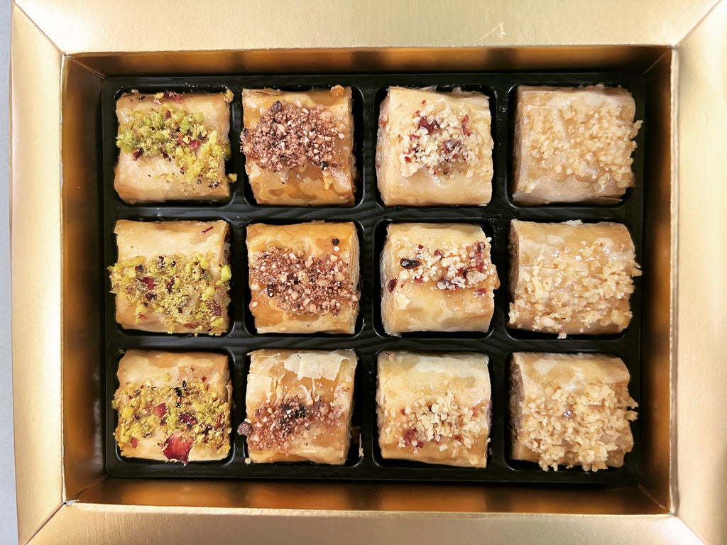 This Baklava Flight includes our Pistachio Chai, Toffee Cacao Nibs, Cranberry Walnut, and Classic Walnut Baklava. The freshly baked baklava is made from paper-thin phyllo sheets that are individually hand-buttered and rolled with freshly chopped nut and spice fillings, baked to perfection, and smothered in our legendary house made syrup.